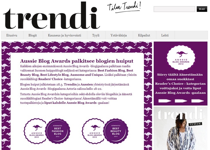 Olen ehdolla Trendi-lehden ja Aussien järjestämässä Aussie Blog Awards -blogigaalassa, joka siis järjestetään nyt ensimmäistä kertaa Suomessa. Minulle on kunnia päästä mukaan ehdolle tuohon ehdolla olevaan joukkoon, ihan hassua että olen mukana.