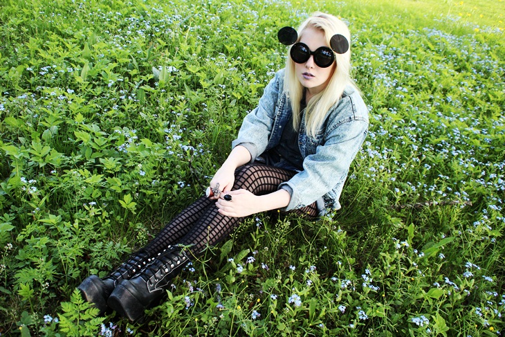 Sunglasses & t-shirt, denim jacket and shorts 2nd hand, tights Gina Tricot, rings H&M and Lindex, boots Jeffrey Campbell