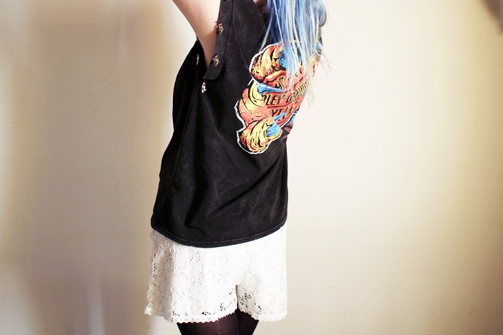 Skull detailed t-shirt (click) Romwe, boots Dr. Martens, lace shorts KappAhl