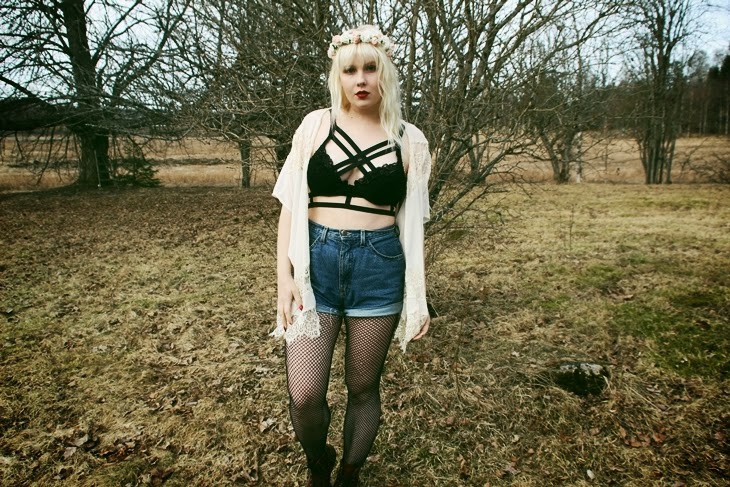 Caged bikini top DIY, midi rings Galisfly (click), kimono Missguided, shorts 2nd hand, sunglasses Lindex, flower headband ebay